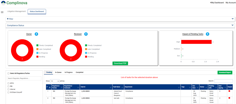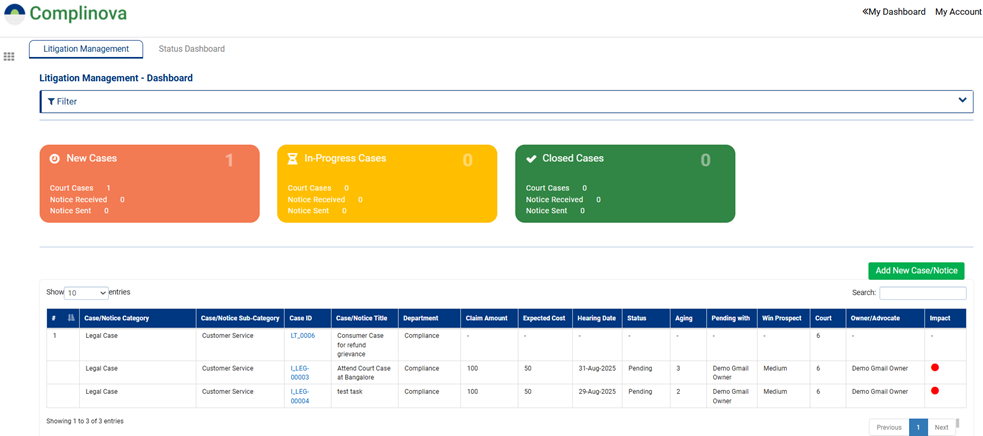 Instant access to the Litigation Management Platform, along with the Case Status view (facility to upload existing list of court cases)